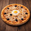 Sauce tomate, fromage, oignons, poivrons, olives, œuf, thon