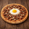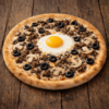 Sauce tomate, Fromage, champignons, viande hachée, olives, oeuf