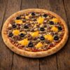 Sauce tomate, fromage, viande hachée, olives, cheddar