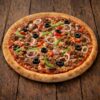 Sauce tomate, fromage, oignons, poivrons, kebab, olives