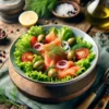 Salade verte, tomates, saumon fumé, champignons, croûtons