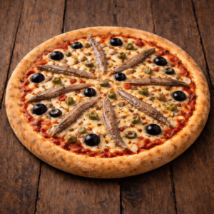 Sauce tomate, fromage, oignons, poivrons, olives, œuf, thon